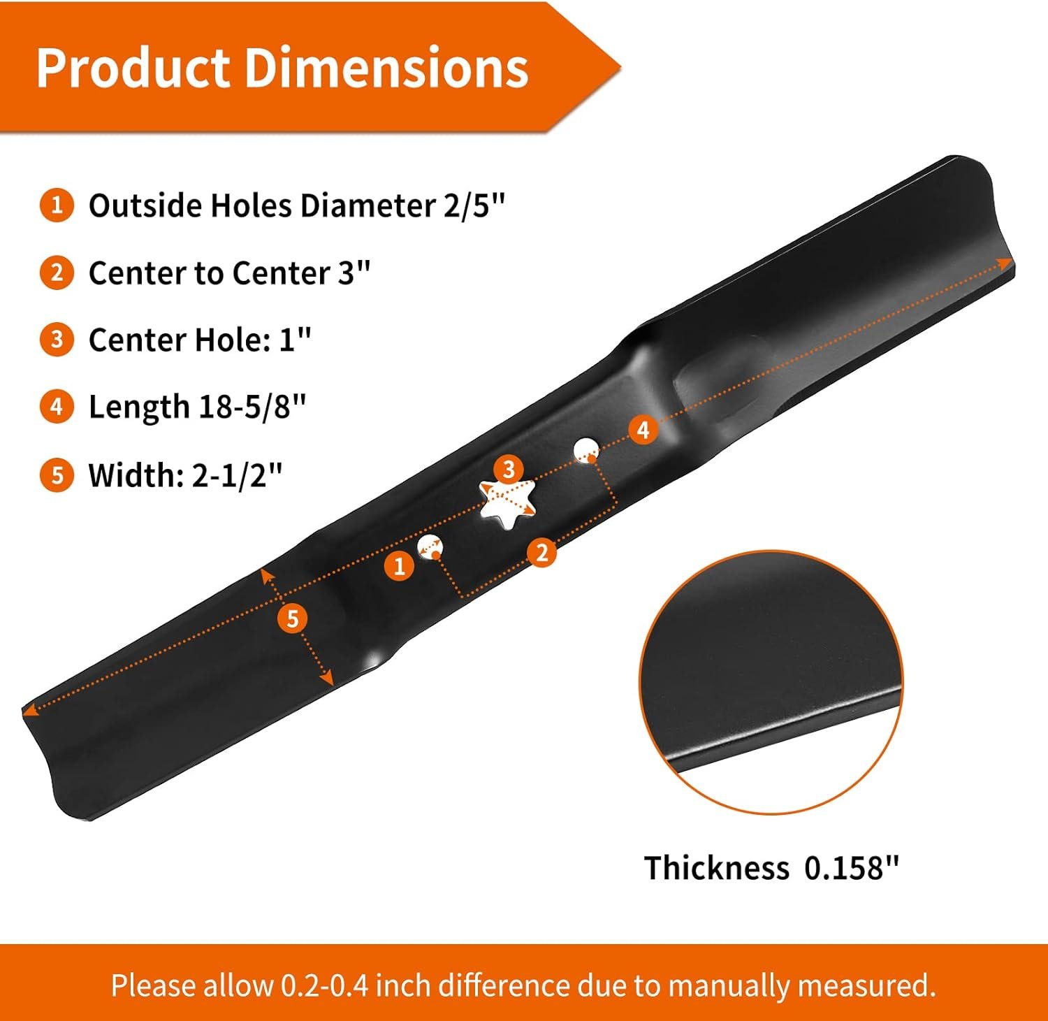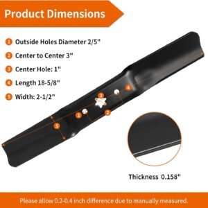 ·【Dimension】Length 18-5/8″, width 2-1/2″, thickness .158″, outside holes diameter 2/5″, center to center (outside holes) 3″, cutting deck 54″